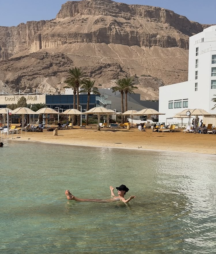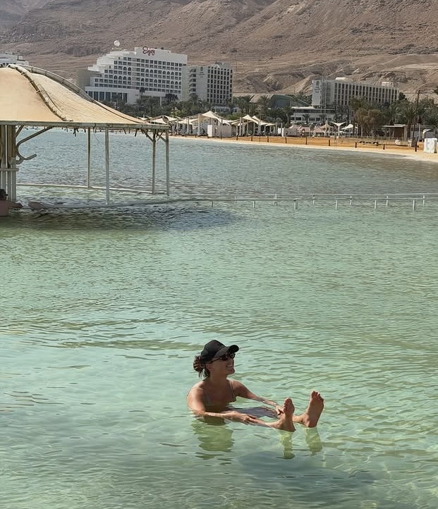 «Ми приїхали на Мертве море, — розповіла акторка. — Тут під ногами не пісок, тут сіль. 33 відсотки солі поки відчувається як просто звичайна вода. У цій воді не можна знаходитись більше пʼятнадцяти-двадцяти хвилин. Ми як поплавки. Якщо є якісь ранки на тілі, відразу це дає про себе знати. Вода гаряченна. Таке враження, що водичка ніби жирна. Це — крутяк!»