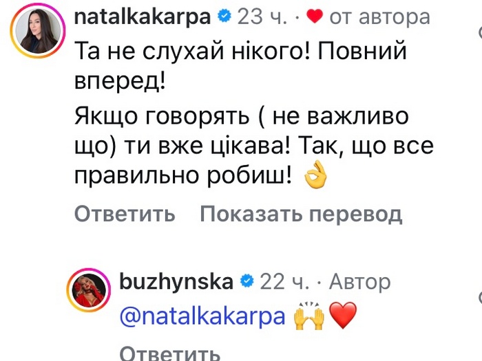 «Та не слухай нікого! — прокоментувала співачка Наталка Карпа. — Повний вперед! Якщо говорять (не важливо, що) ти вже цікава! Так що все правильно робиш!»РЕКЛАМА