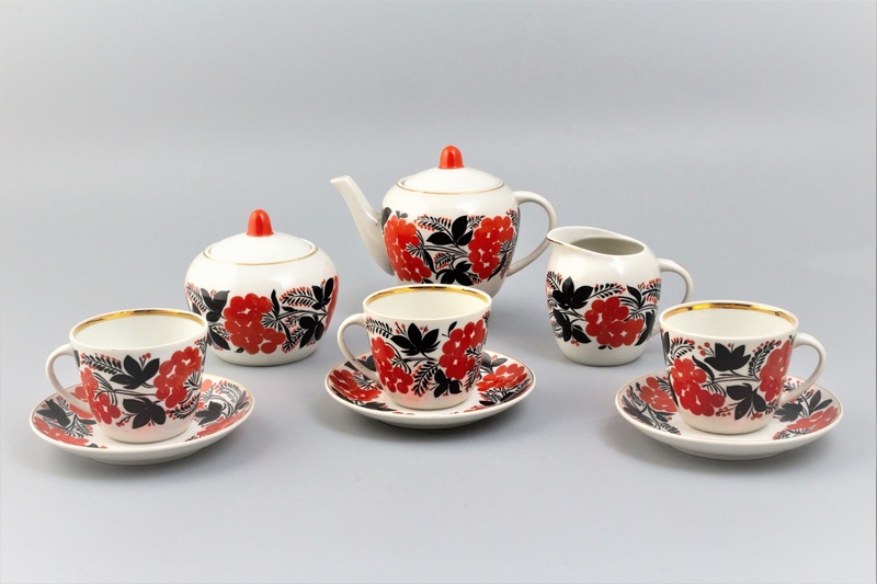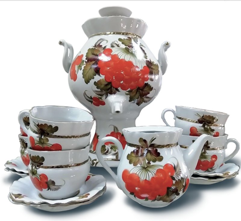 У цьому сервізі кетяги як живі — соковиті, червоні, зібрані у щедрій гірлянді листя, що виблискує зеленаво-золотими відтінками. Усе тут дихає теплотою й святковістю, створюючи атмосферу справжнього родинного чаювання.