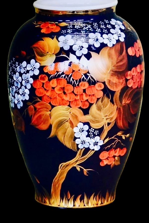 — І ще одна неймовірно гарна ваза створена Анастасією Панчук-Медведковою. Глибоке темно-синє тло, мов осіннє небо після дощу, — ідеальний контраст для рясних кетягів калини, що палають червоним, немов жарини у вечірньому вогні. М’які мазки золотавого листя нагадують дотик вітру, а білі суцвіття додають композиції світлого подиху весни, утворюючи гармонійний цикл — від цвітіння до плодоношення, від пробудження до зрілості.