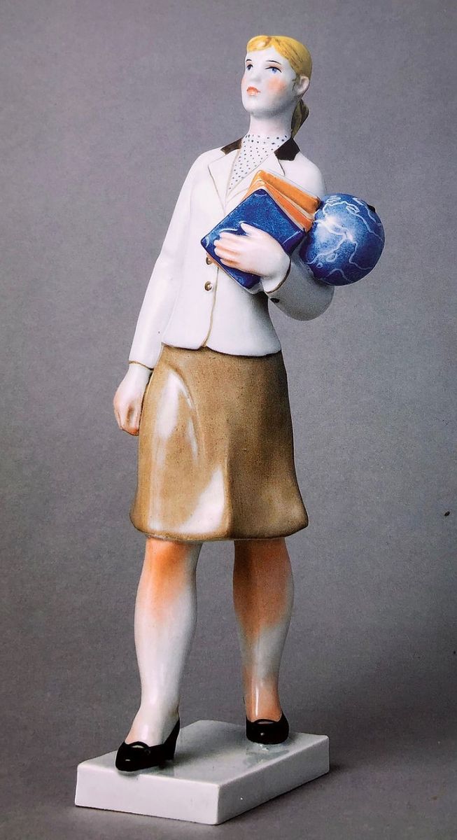 Попри раціональну наукову тематику, фігурки випромінюють тепло. В образах втілені оптимізм розуму, віра в освічену людину, у світ, що змінюється на краще завдяки знанням. Ось порцелянова фігурка «Вчителька» авторства Оксани Жникруп, створена на Київському експериментальному кераміко-художньому заводі (КЕКХЗ) у 1969 році. Висота статуетки — 29,6 сантиметра.