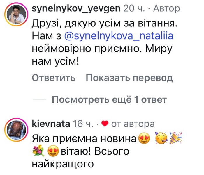 «Друзі, дякую усім за вітання, — написав Євген. — Нам неймовірно приємно. Миру нам усім!»