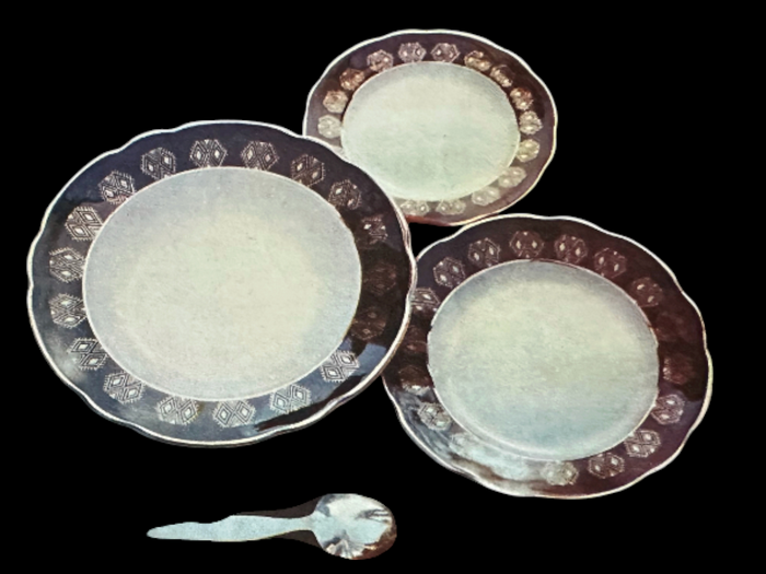 - А ці тарілки з кобальтовим декоруванням та хвилястим краєм створені у 1970 році, — продовжує Людмила Карпінська-Романюк. — Глибокий синій колір — характерна ознака Коростенського фарфору середини ХХ століття — надає виробам урочистості та благородства. Такі столові тарілки уособлювали культуру повсякденності: витончену, світлу, створену для щоденного сімейного обіду та вечері і водночас гідну святкового столу.РЕКЛАМА