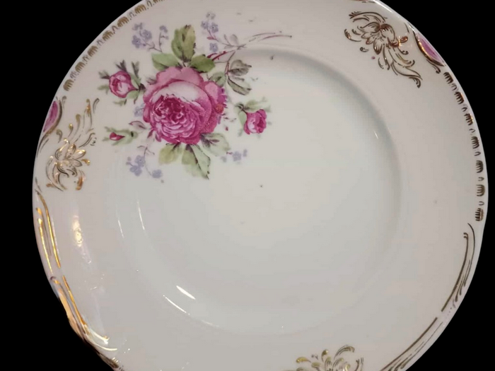 Головний мотив — пишна пурпурова троянда з бутонами й легкими бузковими тінями — виписаний у характерній для 1950-х м’якій живописній манері. Золота стилізована графіка по краю — ручна, тонка, підкреслює шляхетність форми й надає виробу святкової завершеності. Такі тарілки були популярними у святкових сервізах і вважалися ознакою смаку та добробуту українських родин 1950-х років.