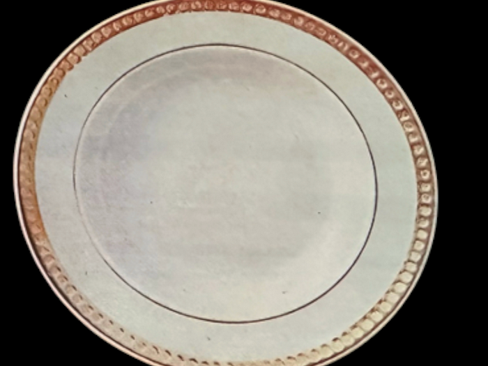 - А от тарілки з широкою блакитною каймою, декорованою напиленням і тонкою золотою лінією. Цей тип орнаменту створював ефект глибини, ніби колір розчиняється у блиску глазурі.