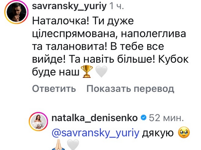 «Наталочка! - звернувся до Денисенко модель Юрій Савранський, з яким їй приписують роман. — Ти дуже цілеспрямована, наполеглива та талановита! В тебе все вийде! Та навіть більше! Кубок буде наш».РЕКЛАМА