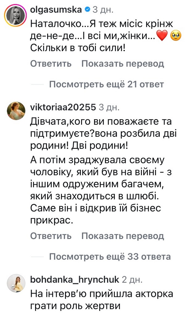 «Наталочко, я теж місіс крінж де-не-де… — підтримала колегу акторка Ольга Сумська. — І всі ми, жінки… Скільки в тобі сили!»