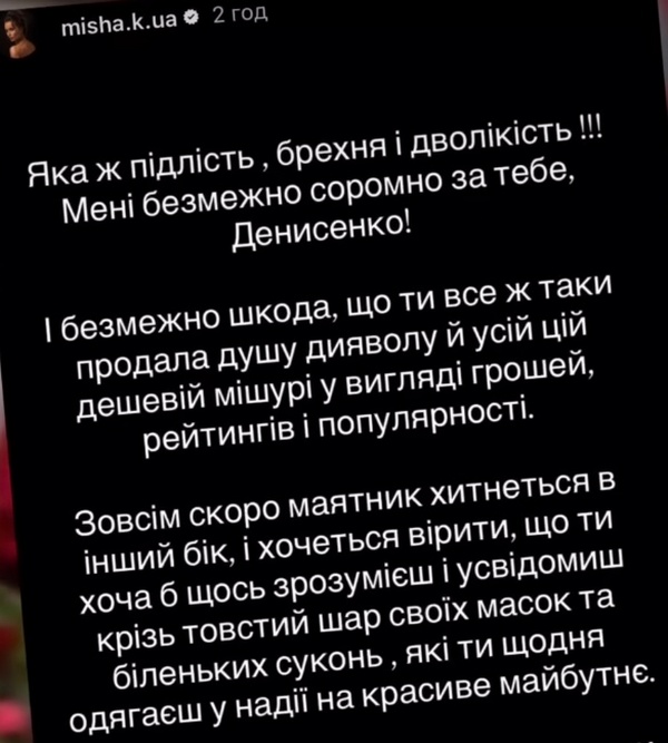 «Яка ж підлість, брехня і дволикість! - прокоментувала акторка Ксенія Мішина. — Мені безмежно соромно за тебе, Денисенко!»