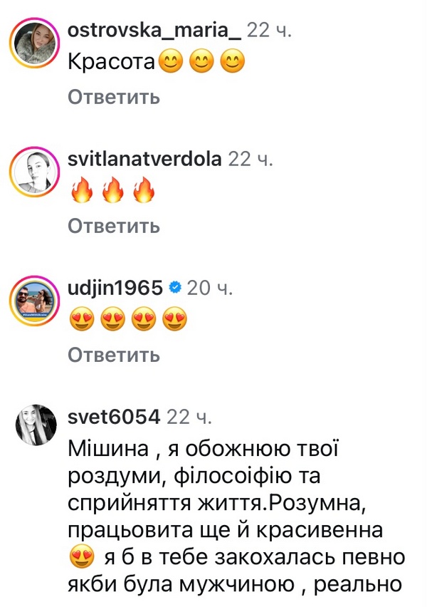 «Мішина, я обожнюю твої роздуми, філософію та сприйняття життя, — зізналися у мережі. — Розумна, працьовита ще й красивенна — я б в тебе закохалась певно, якби була мужчиною, реально».