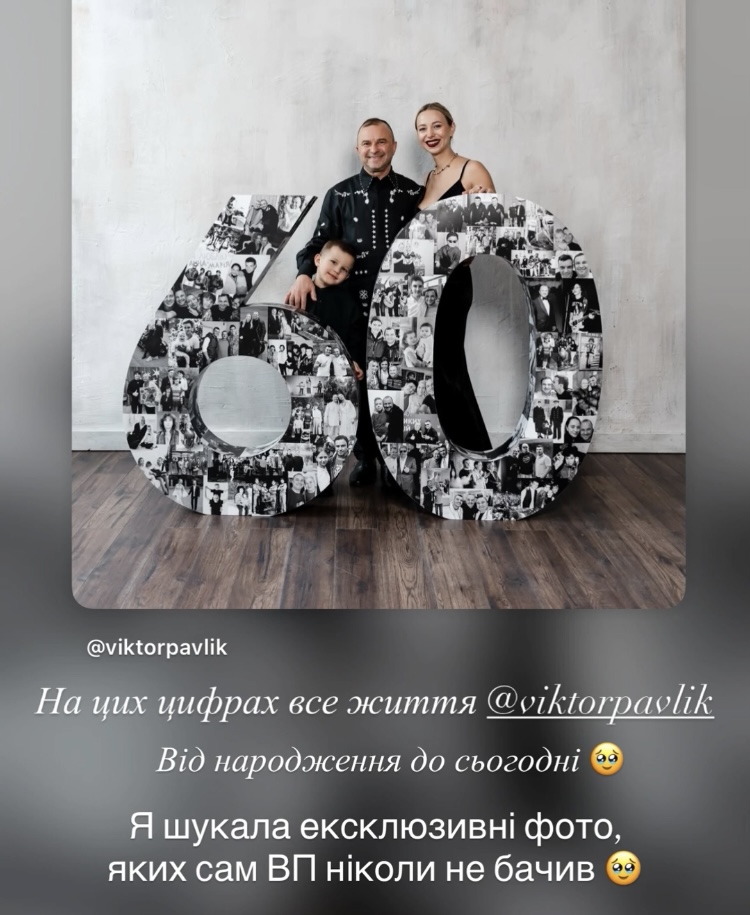 — На цифрах все життя Віктора Павліка, — поділилася Катерина. — Від народження до сьогодні. Я шукала ексклюзивні фото, які сам ВП ніколи не бачив… Найкращий чоловік, тато, син. Найкращий артист!