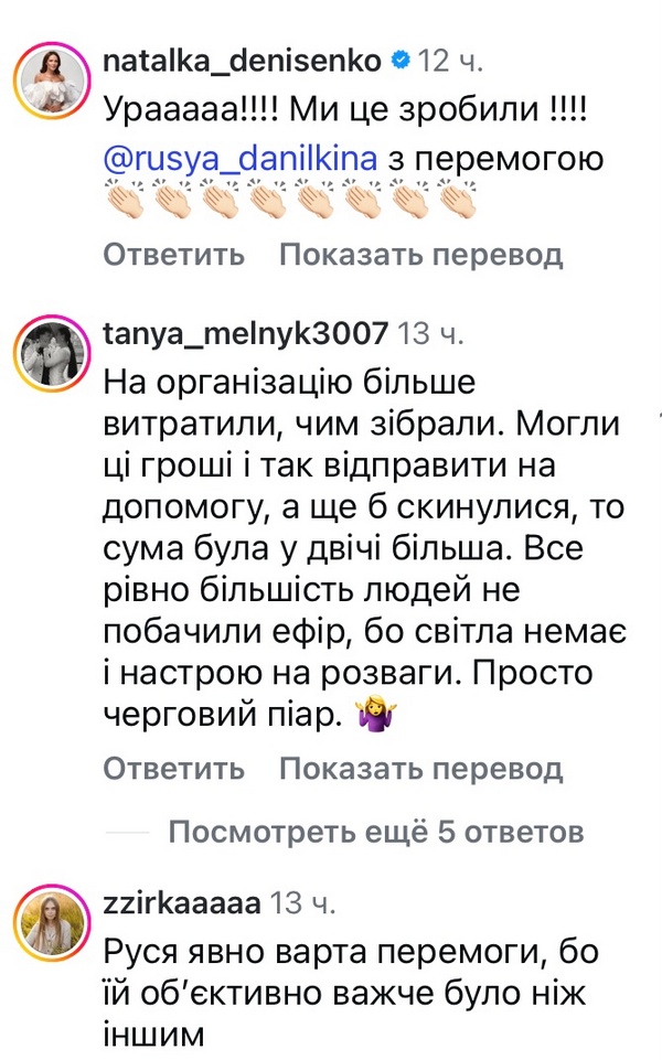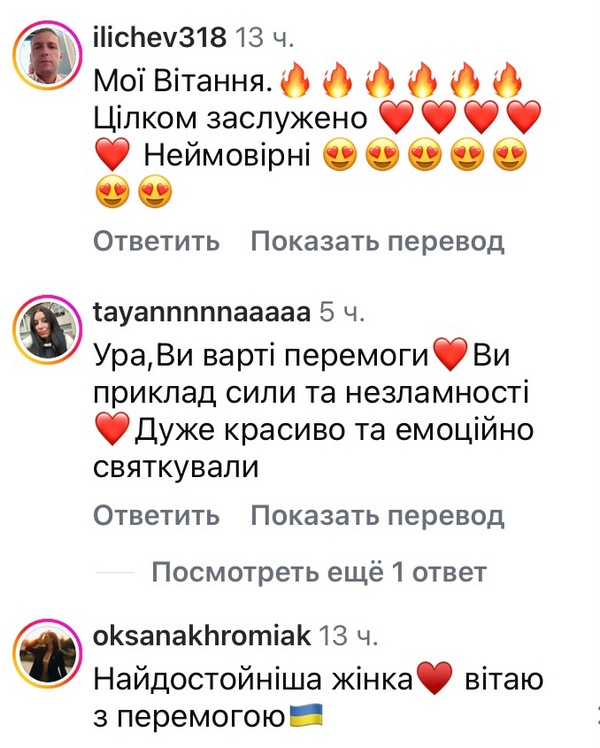 «Руся, вітаю тебе, — відреагували глядачі. - Ти дійсно заслуговуєш на цю перемоги і кому, як не тобі, бути переможницею. Ти — приклад незламності!»