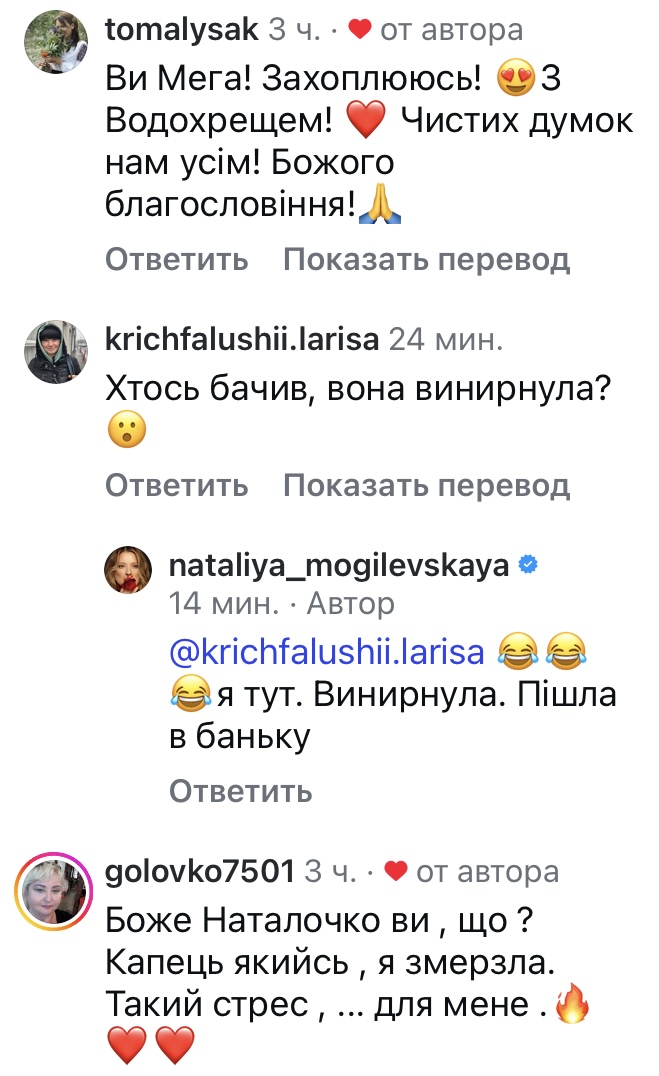 «Зі святом Водохреща, друзі! — підписала відео Наталія. — Нехай свята вода дарує здоровʼя, а в душі завжди панує спокій». РЕКЛАМА
