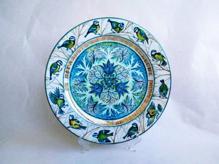 - А ось декоративна тарілка «Синички». Спочатку вона мала назву «Птаство небесне». Ця тарілка є парою до роботи «Лілії польові». Це обереги для дому. Пара тарілок, об'єднаних в єдину композицію, є диптихом.