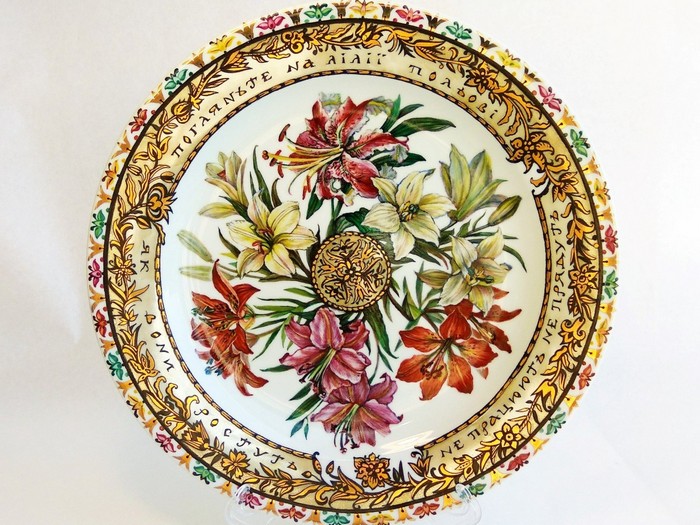 Середина тарелі «Синички» має вигляд орнаментальної розетки: хтось побачить в ній «мандалу», хтось — сніжинку, та насправді розетка в колі — це символ нескінченості, досконалості, непорушності… У оздобленні блюда з польовими ліліями — слова Ісуса з Нагірної проповіді: «Подивіться на польові лілії, як вони ростуть…» Польові лілії є метафорою, що відкриває одну з важливих життєвих істин. У своїй знаменитій проповіді Ісус Христос говорить про польові квіти як приклад Божої турботи про свої творіння, адже Бог дарує квітам такі вишукані вбрання, що «й Соломон у всій славі своїй не одягався так». Таким чином Ісус доносить думку, що люди повинні довіритися Богу й дбати перш за все про духовне. У цій же проповіді Ісус також говорить: «Погляньте на птахів небесних: не сіють, не жнуть, не збирають у комори, а Отець ваш небесний годує їх». Цю цитату я відтворила на тарілці з синичками.