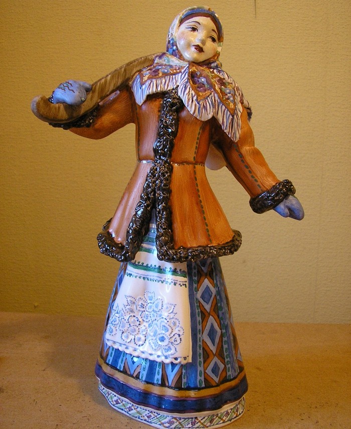 - Результат проявляється лише після остаточного випалу, тому піч і вогонь — мої співавтори, котрі ставлять крапку в дійстві. А коли минає час, скажімо, років п’ять, інколи навіть не можу пояснити, як це було зроблено… Знаєте, мені ніколи не спадало на думку очікувати дива від моєї роботи, адже мистецтво є безперервним експериментом. Колись давно я думала, що от спочатку спробую, а якщо вийде, тоді зроблю начисто… Тепер зрозуміла: у мистецтві ми йдемо не дорогою, навіть не стежкою, а щоразу намагаємося ту стежку проторити. І ніяких гарантій немає. Диво для мене — коли зустрічаєш людину, котра стає тобі ангелом, але ти це розумієш лише багато часу потому, коли навіть сказати «спасибі» вже буває неможливо. Люди зустрічаються — і від їхнього спілкування відбувається диво — подія, твір, дійство… До речі, створення мною робіт на зимову тематику розпочалося зі знайомства у 2004 році з геніальною скульпторкою Фелею Фальчук, яка звернулася до мене з пропозицією розписати її статуетки. Це були дві фігурки із зображенням дівчат у історичному українському вбранні, що несуть коромисла з повними відрами води. Одна була в літньому вбранні, а друга -- у зимовому. Скульптура Фелії Фальчук насичена деталями. Декорування такого предмету вимагало такого ж деталізованого розпису. Так народилися наші з Фелею Яківною «Галя» і «Оксана».