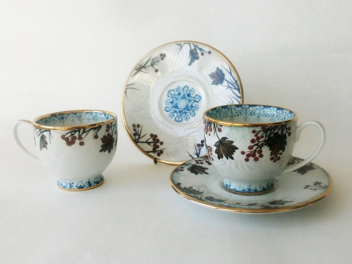 - До зимової теми у своїй творчості я зверталась неодноразово, — розповідає Олена Жернова. — Ось чайна пара — блюдце із чашкою «Зимовий сад». У декорі — гілки калини під снігом: сіро-брунатне листя і залишки ягід, яких вже торкнувся мороз. В центрі блюдця сніжинка як «мандала». У цій композиції застосовано двошаровий розпис, перламутрові розводи відтворюють морозні узори, а по них йде рельєфний силует гілок калини.ВІДЕО ДНЯ