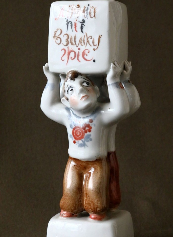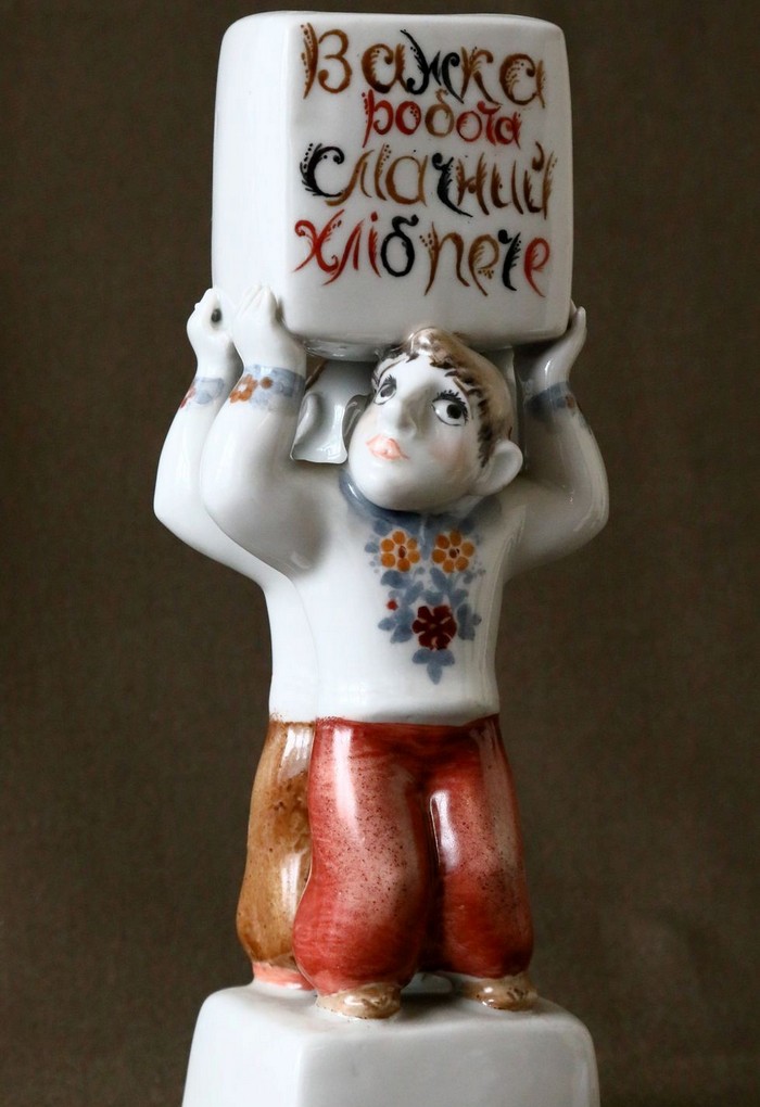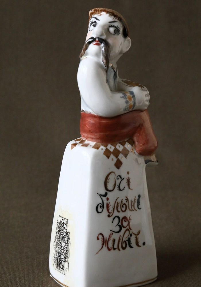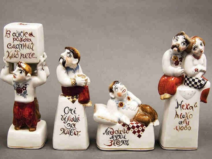 — Ця серія робіт, натхненна українськими прислів’ями та приказками, раритетна, — розповідає Людмила Карпінська-Романюк. — Вона була створена подружжям Валерієм Албулом та Наталією Албул. Надписи на постаментах можна прочитати лише в русі — обходячи фігурки поглядом навколо. Текст тут є частиною композиції і спонукає глядачів замислитися над важливими у житті речами. Лицьовий бік кожної роботи — жест і міміка, зворотній — висновок. Між ними — пауза для власного судження. Персонажі дуже колоритні. Серія скульптур створена на Городницькому фарфоровому заводі у 1983 році.ВІДЕО ДНЯ