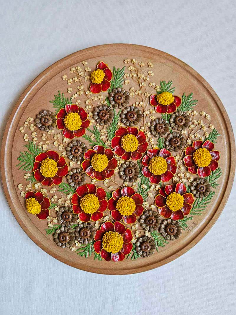 — Ось картина-оберіг «Магія з любов’ю». Чорнобривці — символ, що уособлює рідну землю й тепло батьківської оселі. Червоні нижні пелюстки із жовтим обрамленням виконані з лусок соснової шишки, а яскраво-жовта середина — з нуту, обклеєного насінням перцю. Об’ємна структура насіння надає серцевині особливої виразності. Ця картина ніби наповнена теплом щедрих сонячних променів. Працюючи над нею, я часто замислювалася над тим, що створення оберегу — це не просто робота руками, а розмова душі зі світом. Відтворюючи чорнобривці, хотіла передати їх природну енергію спокою, силу життя та тихе нагадування про нерозривний зв’язок із рідною землею.