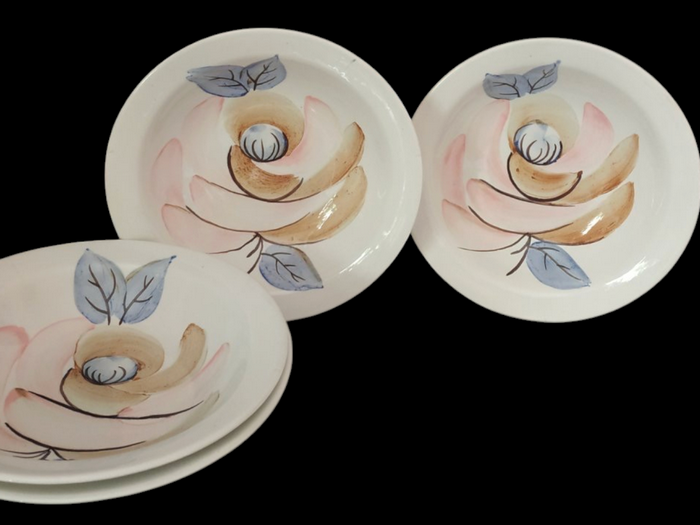 — А ось сервіз «Троянда й незабудка». Троянди тут повні, соковиті, з м’якою тінню пелюсток. Ці квіти тримають центр композиції, а між ними розквітають дрібні блакитні квіти. Вони мов легкий подих повітря. Сітка по краю — не просто орнамент: вона ніби обіймає форму, замикає коло, надає спокою й завершеності. Біле тло тут щільніше, впевненіше. Воно не зникає — воно утримує простір, дає квітам глибину. У цьому фаянсі відчувається школа, рука досвідченої художниці, яка знає міру між декоративністю і тишею. Форми видовжені, дещо урочисті. Блюда схожі на сцени, де квітка розгортає свій рух, а тарілки — на тихі кола, у які хочеться покласти не лише страву, а й настрій дому. Це посуд для столу, за яким не поспішають. Розпис підглазурний — стриманий, але теплий. Цей сервіз — як сад, доглянутий роками.