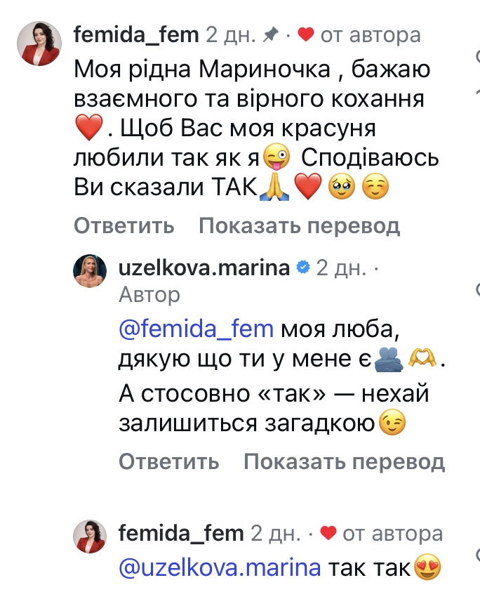 «Стосовно „так“ — нехай залишиться загадкою», — відреагувала Марина.