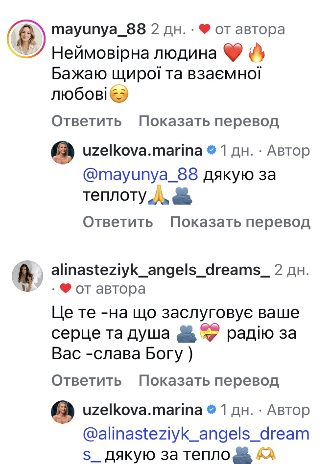 «Марина, будьте щасливі та кохані, — побажали тренерці. — Ви цього варті, дуже радію за Вас».