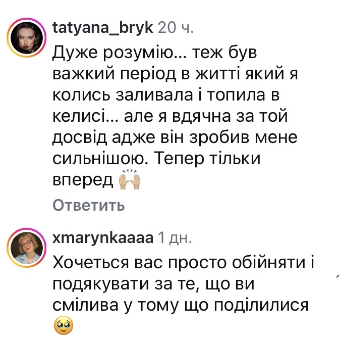 «Дуже розумію… теж був важкий період в житті, який я колись заливала і топила в келиху… але я вдячна за той досвід, адже він зробив мене сильнішою, — підтримали Ліду. — Тепер тільки вперед».