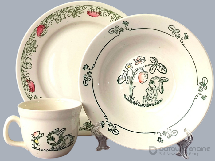 - Так. Саме цей набір сьогодні є характерним зразком продукції Будянського фаянсового заводу 1970-х років і водночас яскравим свідченням того, як у виробах українських керамічних підприємств поєднувалися промислова серійність, художня культура та увага до світу дитинства. А ось ще один неймовірно гарний комплект. Він вирізняється також особливою образною цілісністю декоративного рішення. До його складу входять чашка, глибока мисочка та тарілка, об’єднані єдиною тематикою лісової галявини.
