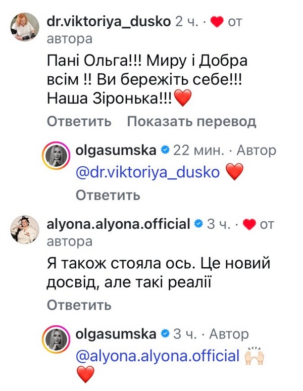 «Пані Ольго, прийміть мою щиру повагу до вас! — подякували Сумській. — З огляду на сьогоднішні обстріли, в тому числі і нашої залізниці цивільної, це, на жаль, є необхідність для вашої безпеки. Тому хочеться просто побажати вам гарно доїхати все ж таки до місця. Дякую, що підтримуйте всіх українців. І звісно ж, наших захисників і захисниць!»