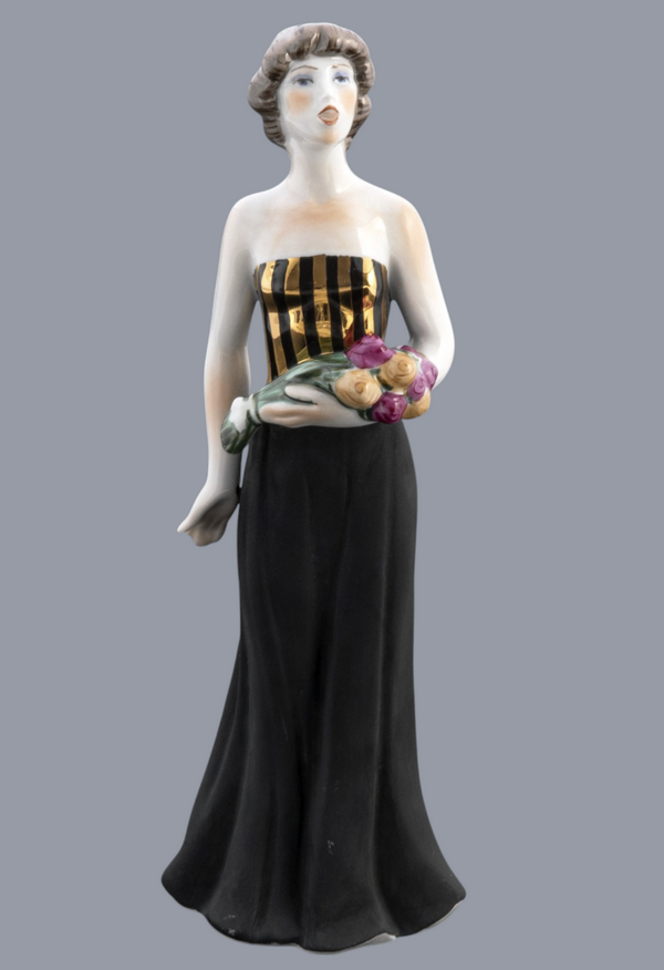 — А ось ще одна робота — «Співачка». У ній мить довіри між виконавицею й слухачем. Мить, коли голос торкається серця. І порцеляна зберігає цю мить назавжди. Тонка постать у довгій чорній сукні, що спадає донизу глибокими хвилями, нагадує завісу сцени перед початком концерту. Її рух стриманий, зібраний, але у цій стриманості відчувається напруга очікування. Золото на корсажі — не просто декоративна смуга, а світло рампи, що ковзає по фігурі. Чорне й золоте — мов темрява зали й сяйво прожекторів. Букет троянд в її руках — мов подяка після виступу. Жовті й рожеві квіти у букеті контрастують зі стриманістю силуету. Вони повертають образ до людського, до тепла. Бо за сценічною постаттю — жінка, вразлива, жива, витончена, як мистецтво, яке вона несе людям. Українські фарфористи другої половини ХХ століття створили унікальну галерею образів співачок. І щоразу, коли світло падає на їхні обличчя, здається: ще мить — і прозвучить перша нота.