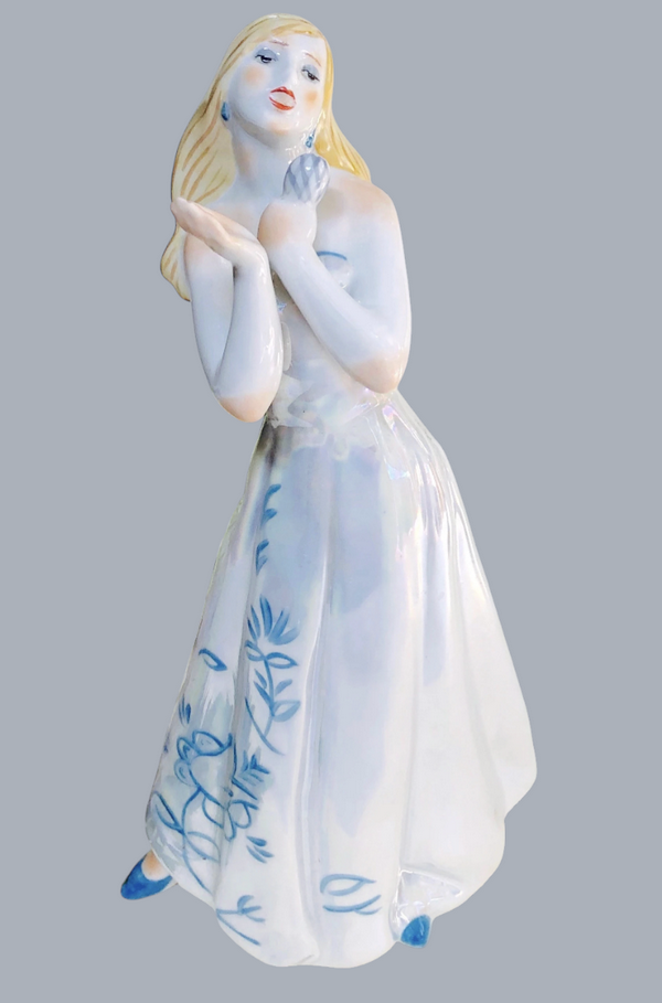 Ця постать — мов світло, розлите в порцеляні. Її сукня вишукана, перламутрова, з легким сяйвом. Золотаве волосся м’яко обрамляє обличчя. Очі трохи піднесені, губи відкриті — у них звучить нота, можливо, висока й тривала. Вона притискає мікрофон до щоки так, ніби це не технічний предмет, а продовження голосу, крихітний свідок її хвилювання. У цьому жесті є щось дуже людське — довіра до сцени, до слухача, до власної пісні. Руки складені в м’якому русі, немов вона обіймає звук. Це жінка з внутрішнім світлом — лірична, зосереджена, вразлива. У 1985 році такий образ звучав по-особливому. Владислав Щербина створює не сценічну зірку, а стан. Порцеляна передає не гучний акорд, а інтонацію — тиху, чисту, майже кришталеву.РЕКЛАМА