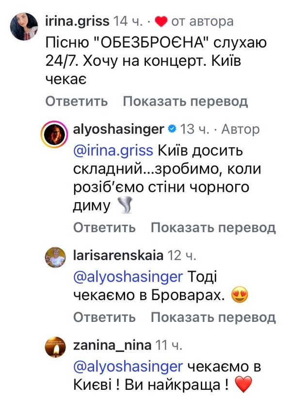 «Пісню „ОБЕЗБРОЄНА“ слухаю 24/7, — поділилися у коментарях. — Хочу на концерт. Київ чекає».
