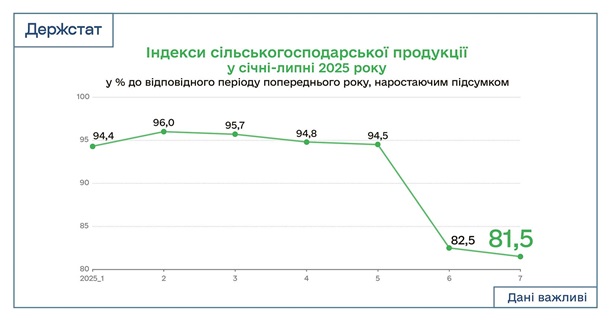 Согласно расчетам, с начала года индекс сельскохозяйственной продукции составил 81,5% к январю-июлю прошлого года. По видам продукции больше всего пострадало растениеводство – сокращение до 74,5%, тогда как животноводство показало более стабильный результат – индекс составляет 95,3%.