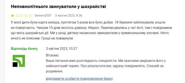 "У моєї дитини була карта юніора, протягом 3 років все було добре. 18 березня заблокували, кошти не повертають. Чекали 15 днів якогось дзвінку. Марно. Переписувались у чат боті, там і повідомили що якісь шахрайські дії. Ми у шоці, дитину незаконно звинуватили у кримінальному злочині. Ніхто нічого не пояснив. Гроші не повернули", - поскаржився чоловік.