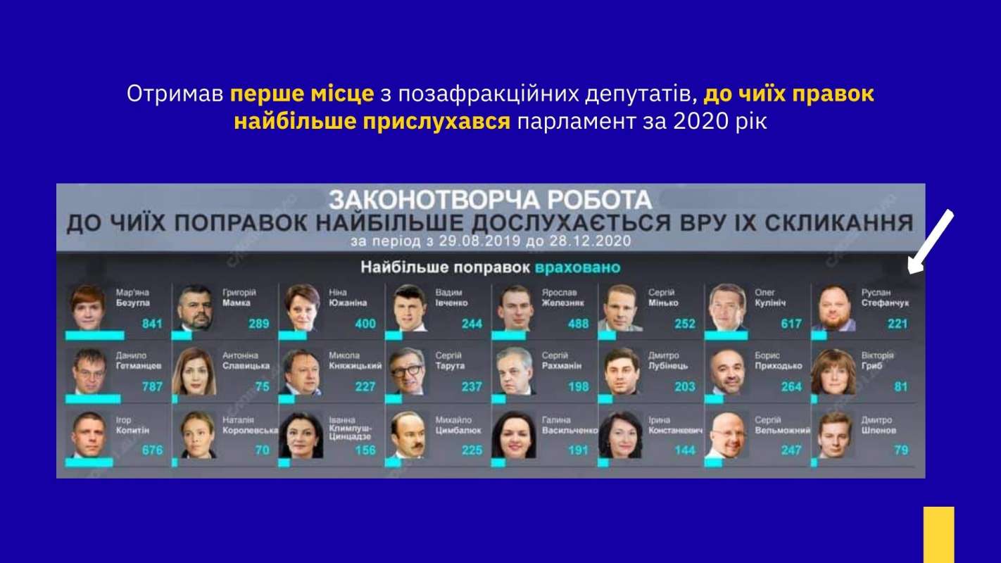 87% з них прийнято. Отримав перше місце з позафракційних депутатів, до чиі?х
