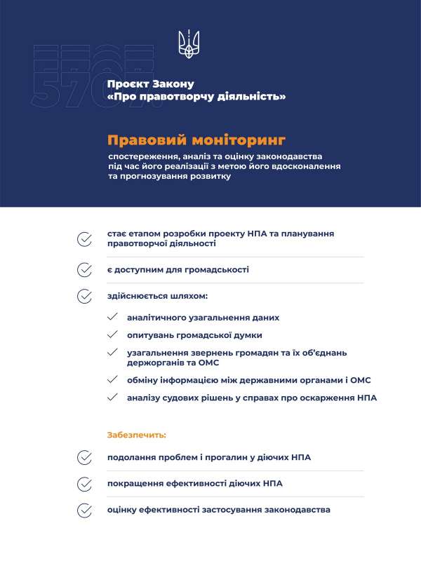 , ініціаторами якого стали 195 народнихдепутатів, якраз передбачає, що правовий моніторинг стане етапом розробки
