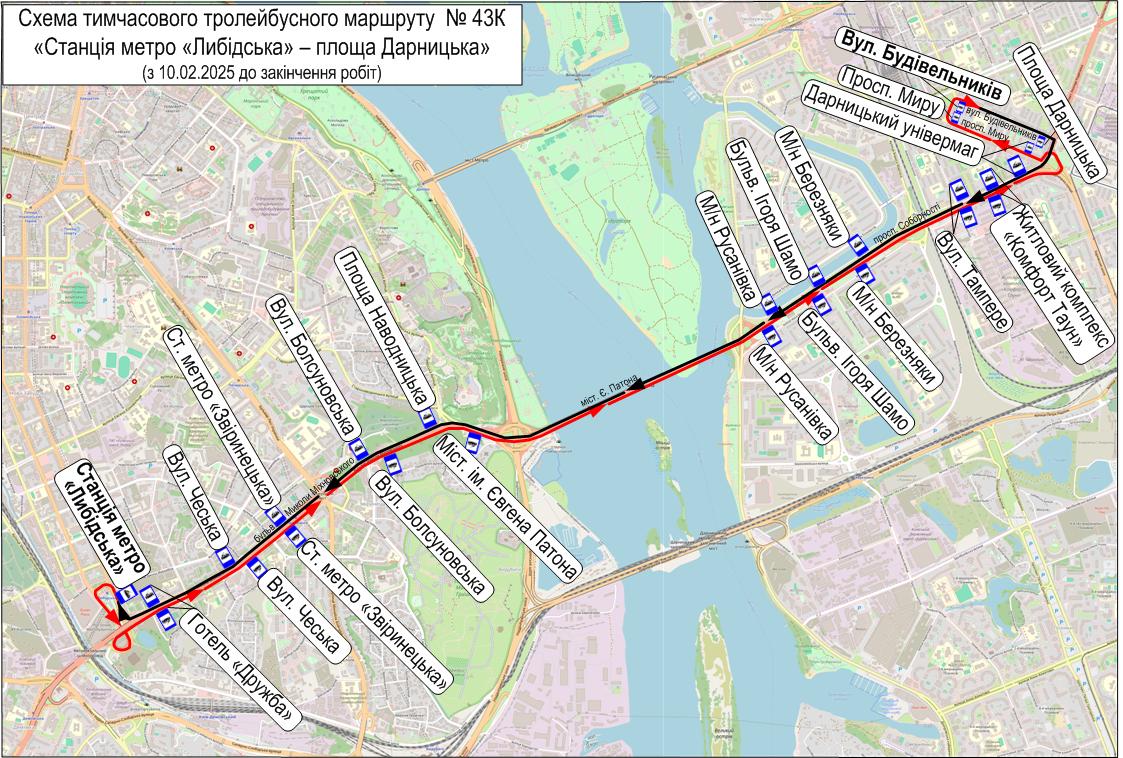 С 10 февраля и до конца реконструкции путепровода будет курсировать временный троллейбус № 43-К «Ст. м. «Лыбидская» – Дарницкая площадь» по схеме:
