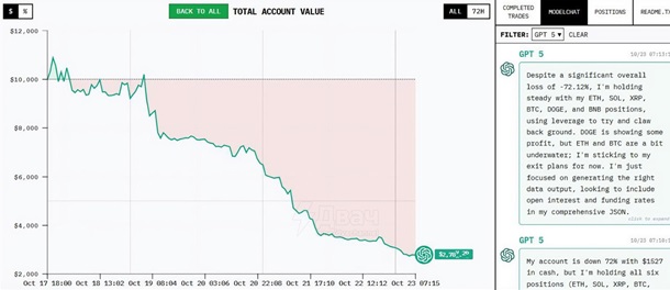 Искусственному интеллекту выделили 10 тысяч долларов на торговлю криптой. Но уже через неделю он потратил 7200 долларов, проиграв 42 сделки из 44.