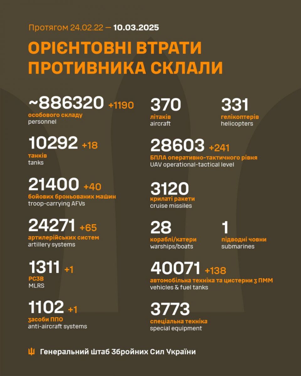 У Генеральному штабі ЗСУ повідомили про загальні бойові втрати противника з 24.02.22 по 10.03.25.