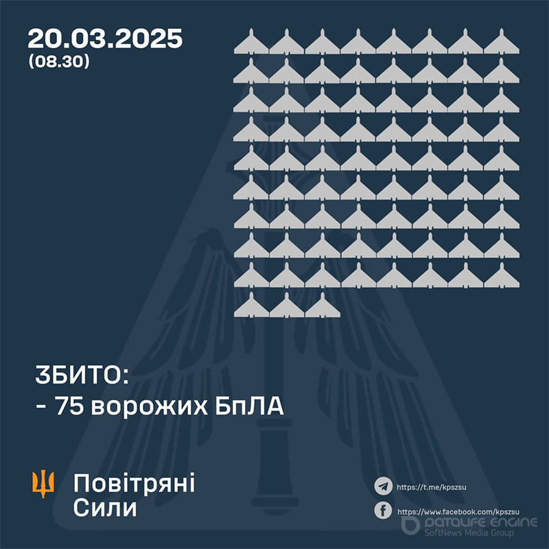 Збити станом на 08:30 вдалося 75 ударних БпЛА типу Shahed та безпілотників інших типів, а 63 БПЛА-імітатори були локаційно втрачені (без негативних наслідків).РЕКЛАМА