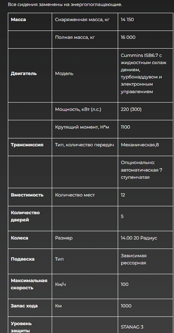 Зауважимо, що свою другу назву — «Хищник 4×4», бронеавтомобіль отримав за те, що він повнопривідний, тобто всі колеса є ведучими і забезпечують техніці хорошу мобільність і прохідність. Загальна вага броньовика може досягати 16 тонн при 12 пасажирах з максимальною швидкістю до 100 км/год і запасом ходу в 1000 км. Броня автомобіля дозволяє захищати екіпаж і десант від бронебійних куль калібром 7,62 мм, мін і вибухівки вагою до 8 кг, а також від осколків 155-мм снарядів на відстані більше 60 метрів.РЕКЛАМА