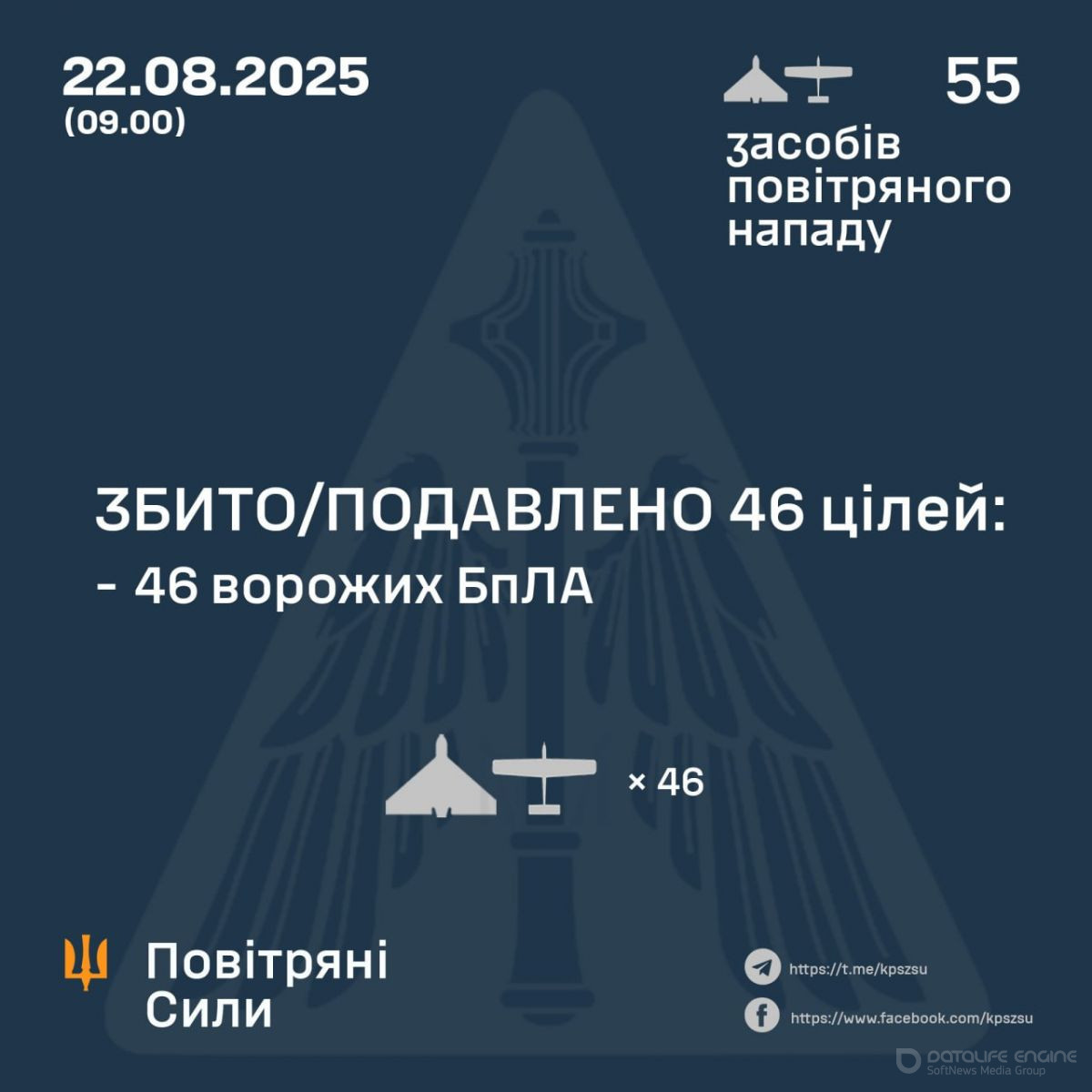 «Повітряний напад відбивали зенітні ракетні війська, підрозділи РЕБ та безпілотних систем, мобільні вогневі групи Сил оборони України. За попередніми даними, станом на 09.00, протиповітряною обороною збито/подавлено 46 ворожих БпЛА типу Shahed і дронів-імітаторів різних типів на півночі та сході країни. Зафіксовано влучання 9 ударних БпЛА на 4 локаціях», — йдеться у повідомленні.
