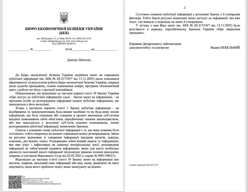Як видно з оприлюдненої відповіді, лист з відповіддю бюро підписав керівник Департаменту забезпечення документообігу та контролю БЕБ Вадим Пекельний.