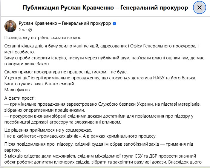 Висловився Руслан Кравченко і з приводу критики на свою адресу. «Найгучніші звинувачення сьогодні лунають від обвинувачених та підозрюваних у кримінальних провадженнях. І це виглядає не як „боротьба за правду“. А як спроба чинити інформаційний тиск на прокурорів, слідство та суд і маніпулювати, прикриваючись „громадською думкою“. Моя позиція проста: прокурори виконують норми закону; суд встановлює вину або невинуватість; а соцмережі — не майданчик для шантажу правоохоронної та судової систем», — додав він.
