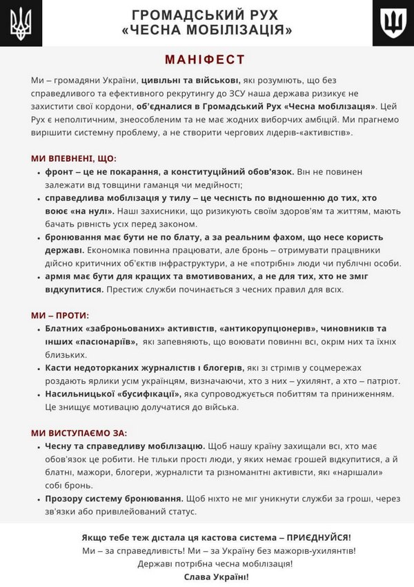 «Ми — проти: блатних „заброньованих“ активістів, „антикорупціонерів“, чиновників та інших „пасіонаріїв“, які запевняють, що воювати повинні всі, окрім них та їхніх близьких. Проти касти недоторканих журналістів і блогерів, які зі стрімів у соцмережах роздають ярлики усім українцям, визначаючи, хто з них — ухилянт, а хто — патріот. Проти насильницької „бусифікації“, яка супроводжується побиттям та приниженням. Це знищує мотивацію долучатися до війська», — зазначається в Маніфесті.