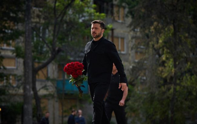Зеленский почтил память погибших на месте удара по дому в Киеве..
